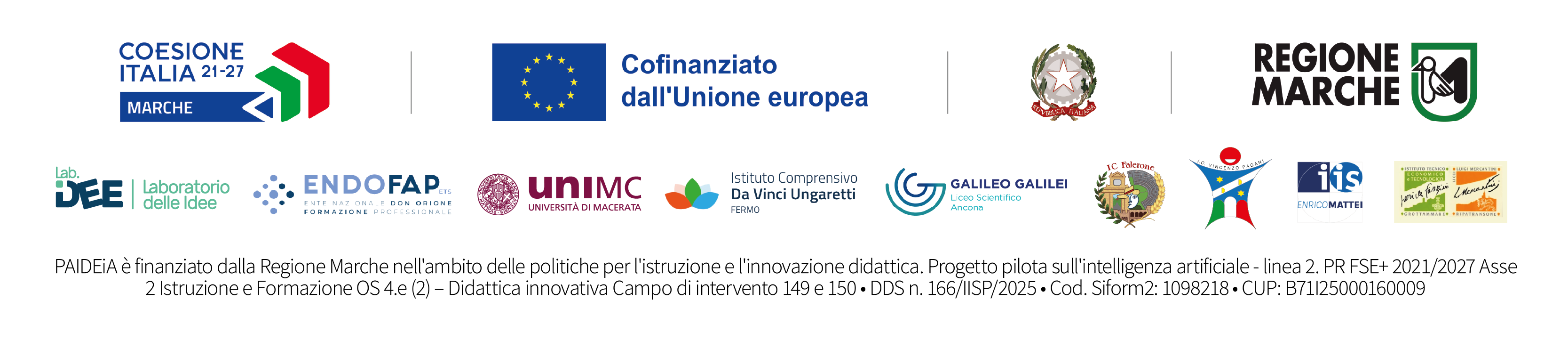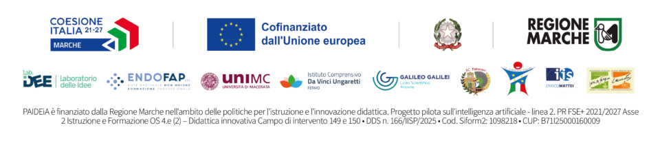 Il nostro Istituto partecipa in qualità di scuola partner al progetto PAIDEIA, finanziato dal PR Marche FSE+ 2021/2027 ASSE ISTRUZIONE E FORMAZIONE Obiettivo Specifico 4.e (2) “Didattica innovativa” Campi di intervento 149 e 150, nell’ambito dell’Avviso Pubblico triennale per la presentazione di “Progetti per la didattica innovativa nelle istituzioni scolastiche”.